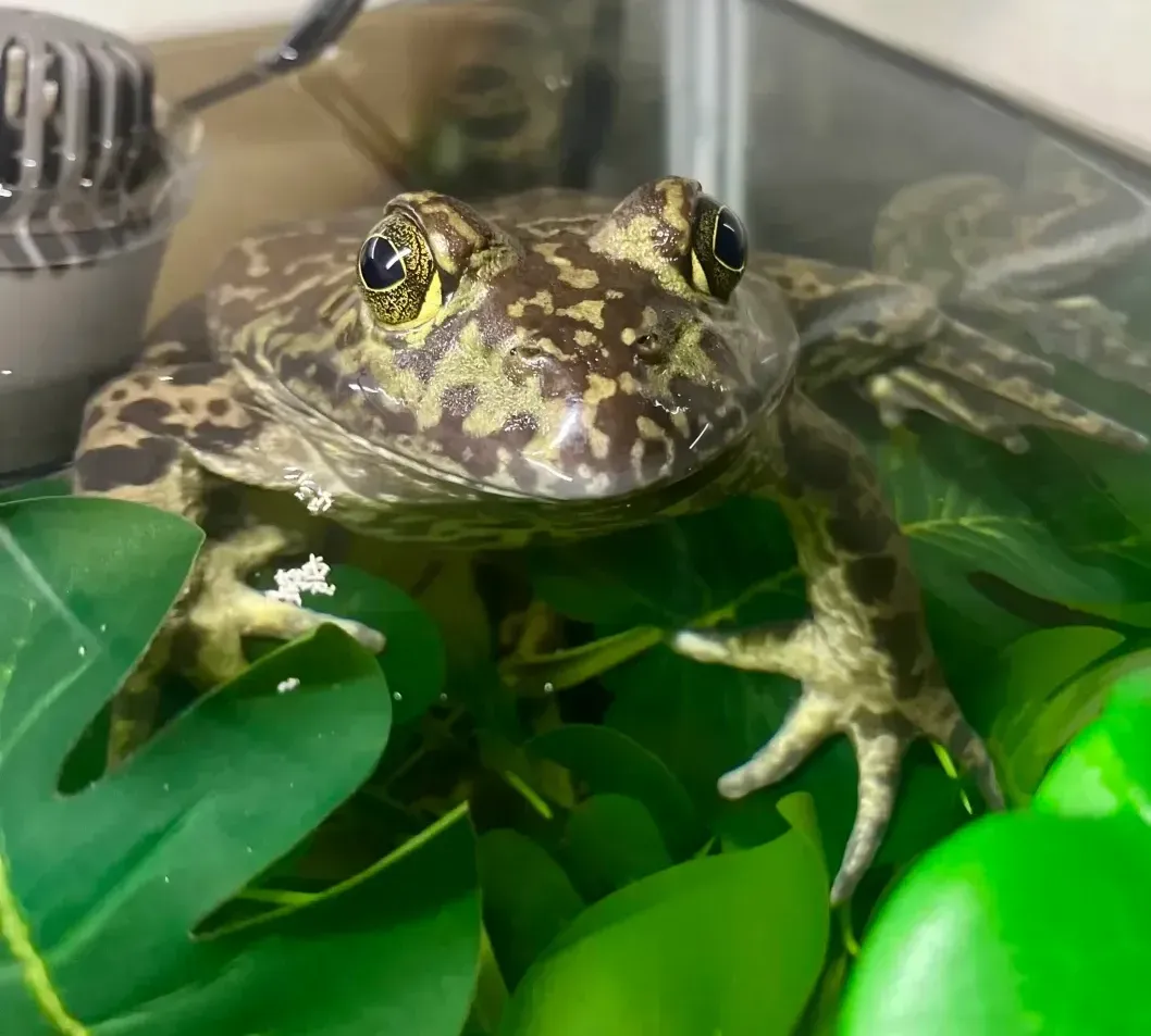 Blob is an American Bullfrog, a locally invasive species here in Merced, California, and many other parts of the state. You can usually find them in Little Lake here on campus. They are considered invasive because they outcompete native frog species, reproduce rapidly, and have no natural predators in many areas. On top of that, they’ll eat just about anything that fits in their mouth—including mice, rats, birds, and even other frogs!