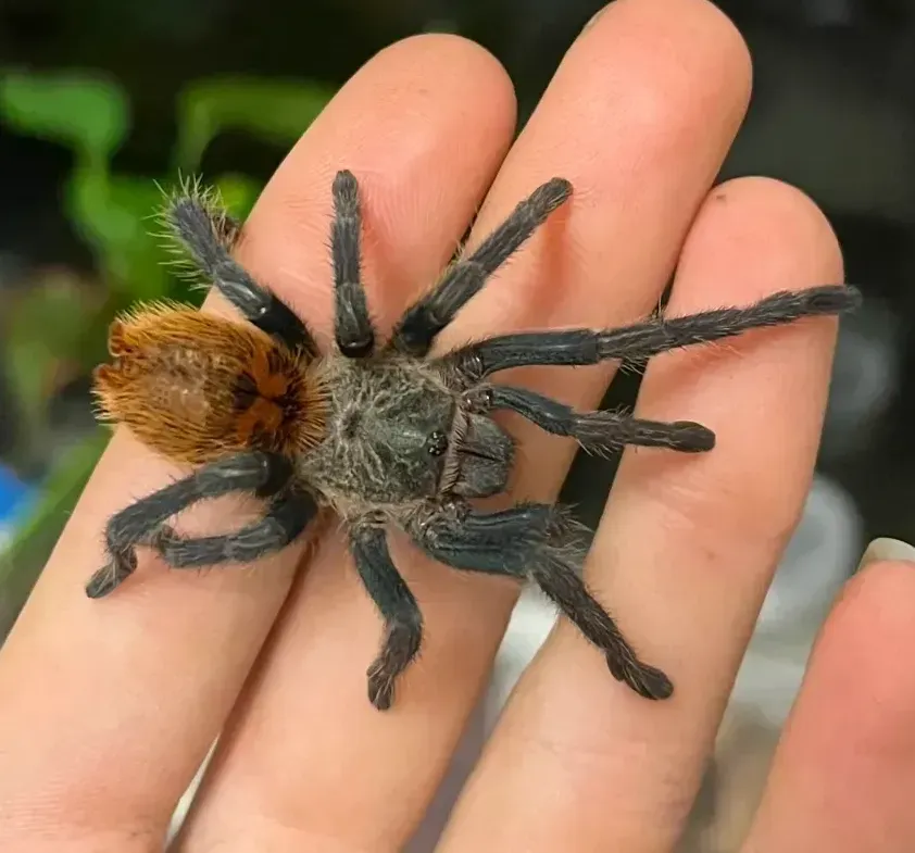 Rojo is a juvenile Red Rump Tarantula! Like many New World tarantulas, they defend themselves by kicking off irritating urticating hairs rather than biting. They are burrowers by nature, often digging tunnels to hide in, especially as juveniles.