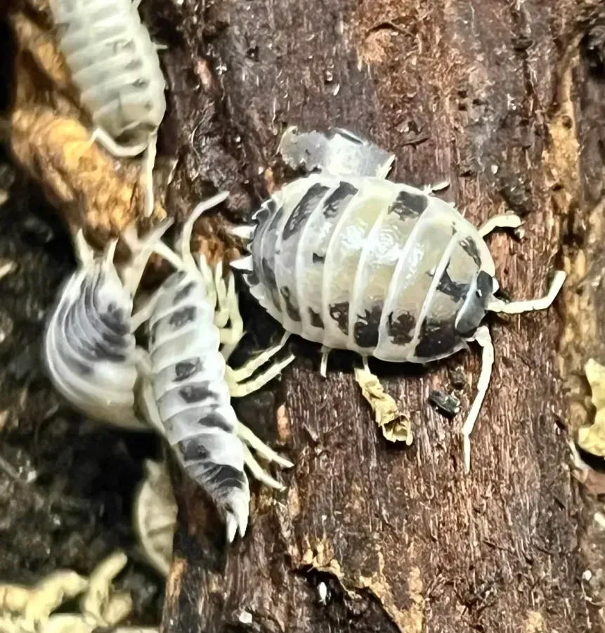 Dairy Cow Isopods are a large, hardy species of terrestrial isopod named for their black-and-white spotted pattern, resembling a dairy cow. They are highly active and one of the most prolific breeders among isopods. Dairy Cows are known for their strong appetite and will quickly break down waste, mold, decaying plant matter and even other invertebrates. Unlike some isopods that prefer to hide, they are bold and often seen roaming their enclosure.