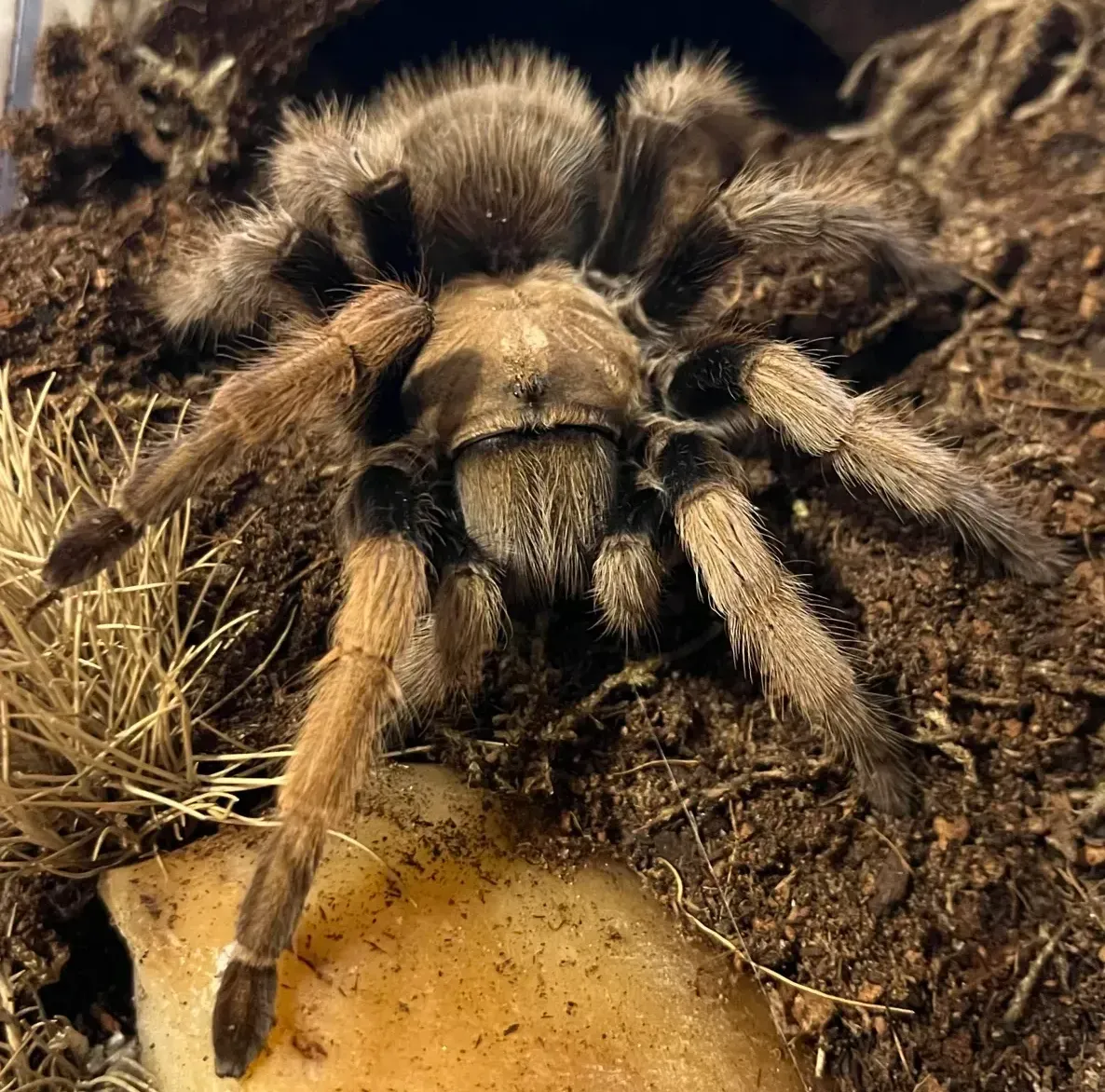 Mocha is an Arizona Blonde Tarantula who was rescued from a situation where she was kept in the same enclosure as a Ball Python, separated only by a divider. Now, she has a proper setup all to herself, where she spends most of her time happily digging. AZ Blonde Tarantulas are known for their calm temperament and rarely bite—instead, they defend themselves by kicking tiny, irritating hairs from their abdomen, similar to a porcupine’s defense. They are also incredibly long-lived, with females reaching up to 20 years or more!