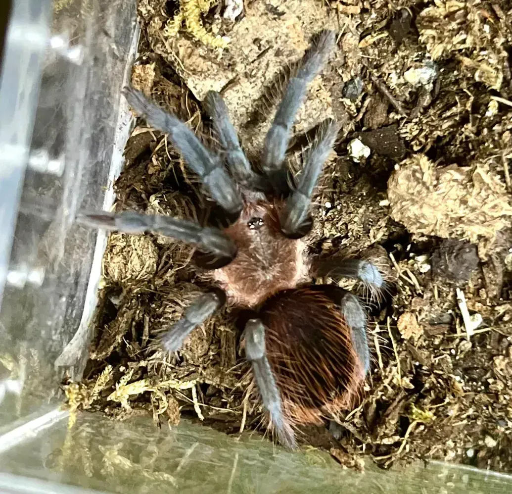 Cosmos is a juvenile Green Bottle Blue also known as a GBB Tarantula, a species known for its vibrant colors and heavy webbing. As adults, they have striking metallic blue legs, a green carapace, and an orange abdomen, making them one of the most colorful tarantulas. GBBs are also extreme webbers, covering their entire enclosure in thick layers of silk.