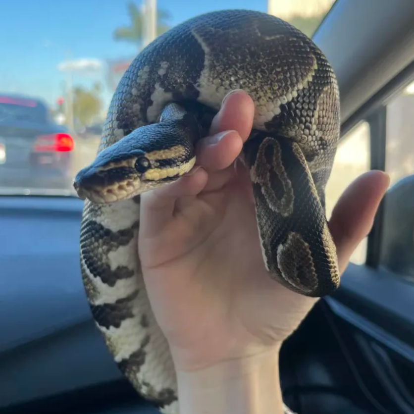 Solaire is a wild morph Ball Python, a species known for their calm temperament and ability to curl into a tight ball when threatened, which is how they got their name. Ball Pythons are one of the most popular pet snake species!