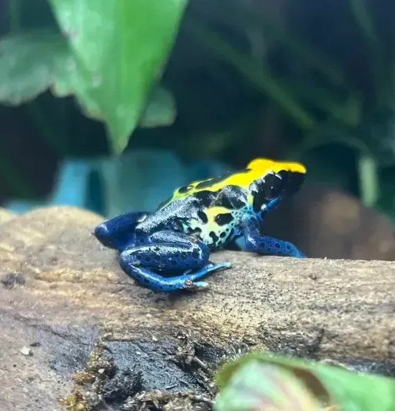 Tic, Tac, and Toe are three Brazilian Yellow-Head Dart Frogs. Dart frogs are not poisonous in captivity because their toxicity comes from their wild diet of ants and mites that contain toxic alkaloids. In captivity, where they eat non-toxic insects like fruit flies and they lose their ability to produce poison. Dart frogs are known for their bright warning colors, a defense strategy called aposematism. Unlike most frogs, many dart frog species are attentive parents, with some carrying their tadpoles on their backs to safe water sources.