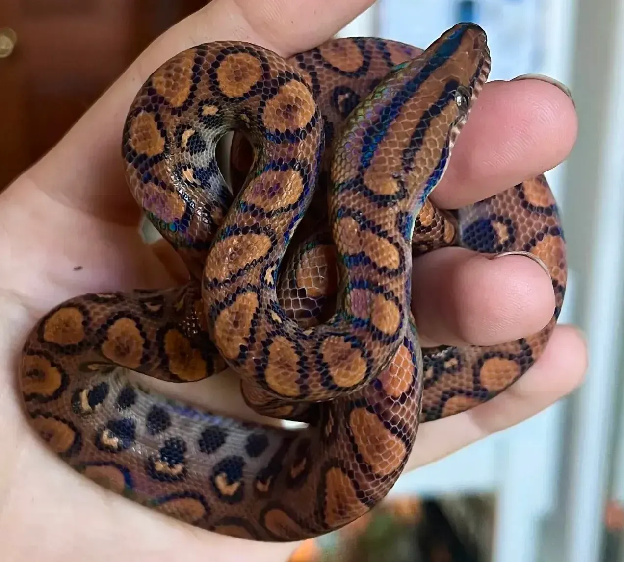 Topaz is a 3-year-old Brazilian Rainbow Boa. These boas have microscopic ridges on their scales that refract light, creating their signature colors. They are semi-arboreal, meaning they spend time both on the ground and in trees, especially when young like Topaz. Unlike many other snakes, they give birth to live young instead of laying eggs.